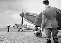 Curchin's acting rank of pilot officer was confirmed on 6 April 1940 although he remained on probation.[6] His first operational posting was to No. 600 Squadron;[4] his new unit was based at Northolt at the time and flew the Bristol Blenheim long-range fighter in a night fighter role.[7] On 11 June Curchin was transferred to No. 609 Squadron,[5] also at Northolt but equipped with the Supermarine Spitfire fighter. It had been heavily engaged in covering the evacuation of the British Expeditionary Force from Dunkirk.[8] The following day, his probationary period ended and his pilot officer rank was made substantive.[9]