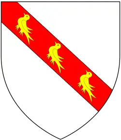 Arms of Danvers (modern) adopted by John Danvers (died 1449), being his maternal arms of Brancestre: Argent, on a bend gules three martlets or.[1] His descendants (including the Danvers baronets and the Earl of Danby) reverted to his paternal arms of Danvers ancient (Gules, a chevron between three mullets of six points pierced or)