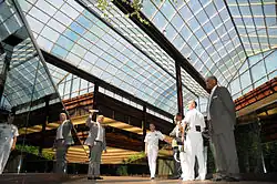The complex opened on April 20, 1964. The buildings were designed by the Finnish-American architect Eero Saarinen, who died before its construction was complete, only four days after he signed the contract for the newest buildings. The project was finished by architect Kevin Roche. It was built according to Deere & Company President William Hewitt's instructions using COR-TEN weathering steel—one of the first architectural applications of the material—which gave the building an earthy look as it oxidized and aged.[1][3][4] In celebration of the 2018 Illinois Bicentennial, the John Deere World Headquarters was selected as one of the Illinois 200 Great Places [5][6] by the American Institute of Architects Illinois component (AIA Illinois) and was recognized by USA Today Travel magazine, as one of AIA Illinois' selections for Illinois 25 Must See Places.[7]