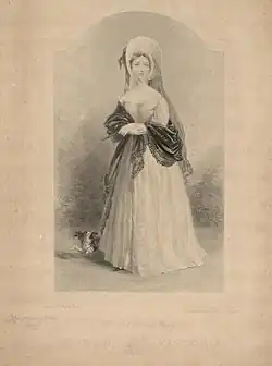 Francis was most successful as a figure and portrait painter. During his artistic career he completed a number of portraits of well known societal and political figures including Queen Victoria and Sir Robert Peel. Deffett's watercolour portrait of Queen Victoria (pictured on the right), displays the monarch with her dog, Dash, bounding by her side. The young monarch stands in a garden, elegantly attired in a bonnet and shawl. The painting was executed in 1837, the year that Queen Victoria assumed the throne, which may account for her youthful appearance. The painting was engraved and printed by Frederick Christian Lewis in 1838, a year after its original completion, and is still held in the Royal Collection.[6] Prints made after John Deffett Francis' figurative portrait paintings include: Madlle. Cerito: A Dancer (1858); Emma Romer, lithograph (n.d.); Fanny Cerito (1846); W.C. Macready (n.d.); Major General Sir William Nott, (1845); Captain Bowen Davies (1844) and Robert Peel (1841), and form part of the bequest made to the British Museum.[7]