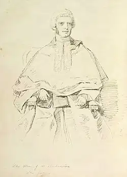 Dickinson was the son of Nodes Dickinson, F.R.C.S., of London, Staff-Surgeon to Her Majesty's Forces, and was born on the island of Grenada, West Indies.[2] He was educated at Caius College, Cambridge, where he took his B.A. degree in 1829, and graduated M.A. in 1832. He was called to the bar at the Inner Temple in 1840. Dickinson married, early in 1844, Helen, daughter of Captain Henry Jauncey.[2] In June 1844 Dickinson went to Sydney, in the Garland Grove,[1] with the appointment of Puisne Judge of the Supreme Court of New South Wales.[2] An 1851 portrait by Marshall Claxton of Dickinson with his wife and infant daughter hangs in the Art Gallery of NSW.[3] Dickinson acted as chief justice of New South Wales from 15 February 1860 to 17 February 1861 during the absence of Sir Alfred Stephen.[1]