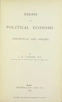 - ^ Blaug, Mark, ed. (1986). "CAIRNES, JOHN ELLIOT". Who's Who in Economics: A Biographical Dictionary of Major Economists 1700-1986 (2nd ed.). Wheatsheaf Books Limited. p. 139 – via Internet Archive.