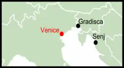 The signing of the Twelve Years' Truce and the end of the War of the Jülich Succession deprived John Ernest of the opportunity to distinguish himself further.[11] In 1616 the Republic of Venice under Doge Giovanni Bembo requested assistance from the States General of the Netherlands in its struggle with Archduke Ferdinand of Inner Austria over the borders of Istria and Friuli and the protection which Ferdinand granted to the Uskoks, notorious pirates in the Adriatic Sea. After these Uskoks, this war between Venice and Inner Austria was called the Uskok War. The request concerned foot soldiers and cavalry.[21] John Ernest obtained permission from the States General in a resolution of 3 October 1616 to enter the service of the Venetian Republic with a regiment of foot soldiers.[22] The permission concerned a leave of absence from State service for one year to enable him to take command of 3,000 men.[21]