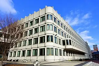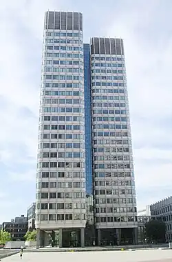 John Fitzgerald Kennedy Federal Building is a United States governmental office building located in the Government Center area of Boston, Massachusetts, adjacent to City Hall Plaza and diagonally across from Boston City Hall. An example of 1960s modern architecture, and designed by Walter Gropius and The Architects Collaborative with Samuel Glaser, it is a complex that consists of two offset 26-floor towers that sit on-axis to each other and a low rise building of four floors that connects to the two towers through an enclosed glass corridor.[1] The two towers stand at a height of 387 feet (118 m).[2] The complex was built in 1963-1966.[1] It was listed on the National Register of Historic Places in 2021.[3]