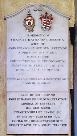 Fisher married Frances Katharine Josepha Broughton, known as "Kitty", the daughter of the Rev. Thomas Delves Broughton and Frances Corkran, on 4 April 1866 while stationed at Portsmouth.[28] Kitty's two brothers were both naval officers. According to a cousin, she believed that Jack would rise "to the top of the tree."[29] They remained married until her death in July 1918. They had a son, Cecil Vavasseur, 2nd Baron Fisher (1868–1955), and three daughters, Beatrix Alice (1867–1930), Dorothy Sybil (1873–1962), and Pamela Mary (1876–1949), all of whom married naval officers[30] who went on to become admirals: Beatrix Alice married Reginald Rundell Neeld in 1896;[31] Pamela Mary married Henry Blackett in 1906;[32] and Dorothy Sybil married Eric Fullerton in 1908.[33]
