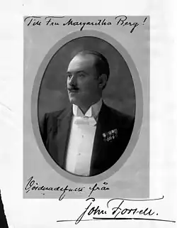 Carl Johan Jacob Forsell (6 November 1868 – 30 May 1941), known as John Forsell, was a prominent Swedish baritone, opera administrator and teacher of voice. He was the leading baritone of the Royal Swedish Opera (RSO) from 1896 to 1918, and thereafter sang roles periodically with the company until his last stage performance in 1938. From 1923б to 1939 he served as the director of the RSO. He also sang leading roles as a guest artist with opera companies internationally, drawing particular acclaim for his portrayal of the title character in Wolfgang Amadeus Mozart's Don Giovanni.[1]