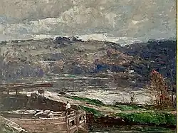 Folinsbee was represented by Ferargil Gallery in New York City for most of his career, and his paintings were exhibited across the country and in several international exhibitions.[11] He won nearly every award given by the National Academy of Design, receiving some of them multiple times.[a] He exhibited at the Pennsylvania Academy of the Fine Arts most years from 1915 to 1952, and was awarded the 1931 Jessie Sesnan Medal (for Canal and River).[21] He also won awards from the Connecticut Academy of Fine Arts, the Rhode Island School of Design, the Corcoran Gallery of Art, the Salmagundi Club, and other arts organizations, including a bronze medal at the 1926 Sesquicentennial Exposition in Philadelphia (for Outskirts of Trenton).[11]