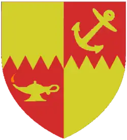 Quarterly per fess indented Or and Gules in the second quarter an anchor in bend sinister of the first and in the third quarter an antique lamp also Or fired Proper.