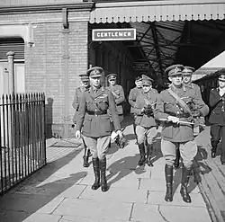 King George VI (left) with Major General John Grover (right) and several officers at a railway station at Gloucestershire, 1 April 1942.