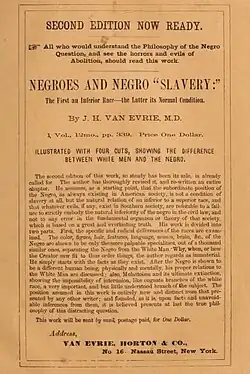 John H. Van Evrie (1814–1896)[1] was an American physician and defender of slavery[2] best known as the editor of the Weekly Day Book and the author of several books on race and slavery which reproduced the ideas of scientific racism for a popular audience.[3] He was also the proprietor of the publishing company Van Evrie, Horton & Company.[4] Van Evrie was described by the historian George M. Fredrickson as "perhaps the first professional racist in American history."[5] His thought, which lacked significant scientific evidence even for the time,[6] emphasized the inferiority of black people to white people, defended slavery as practiced in the United States and attacked abolitionism, while opposing class distinctions among white people and the oppression of the white working class. He repeatedly put "slave" and "slavery" in quotation marks, because he did not think these were the right words for enslaved Blacks.