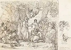 In 1759, Mortimer won a first prize for a study after Michelangelo's Bacchus and a second prize for a life drawing. He began to exhibit his works on a regular basis in the early 1760s, becoming an active member of the Society of Artists,[7] which awarded him prizes for paintings of subjects from British history in 1763 and 1764. The second of these prizes was for a picture entitled St Paul Preaching to the Ancient Druids in Britain (now in the Guildhall in High Wycombe).[8] He became president of the society in 1774.[7]