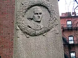 Despite his grand funeral, Hancock faded from popular memory after his death. According to historian Alfred F. Young, "Boston celebrated only one hero in the half-century after the Revolution: George Washington."[206] As early as 1809, John Adams lamented that Hancock and Samuel Adams were "almost buried in oblivion".[207] In Boston, little effort was made to preserve Hancock's historical legacy. His house on Beacon Hill was torn down in 1863 after both the city of Boston and the Massachusetts legislature decided against maintaining it.[208] According to Young, the conservative "new elite" of Massachusetts "was not comfortable with a rich man who pledged his fortune to the cause of revolution".[208] In 1876, with the centennial of American independence renewing popular interest in the Revolution, plaques honoring Hancock were put up in Boston.[209] In 1896, a memorial column was erected over Hancock's essentially unmarked grave in the Granary Burying Ground.[193]