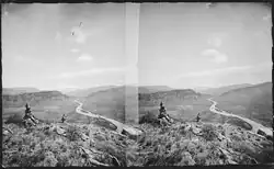 Mills continued to sell paintings and contributed art and articles to publications,[40][46][47] while periodically travelling into the mountains to sketch.[40] As his wife's health improved, they bought a wagon and began to travel the lands.[48] They made a trip to the Colorado Basin, called "Middle Park", and found a place to make a homestead.[48] Around 1874 they were living in what was then called Hot Sulphur Springs, where Henrietta held a school.[49][50][7]: p58 This later became the subject of his painting "First School in Middle Park".[51][50] However, while the scenery was rich and inspiring, there was no local market for his art and it was a difficult life.[7]: p60 At one point, Mills suffered from rheumatic fever and had to be rescued by hunters.[7]: p57