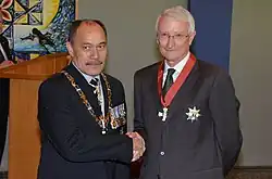 Hood (right) in 2014, after his investiture as a Knight Companion of the New Zealand Order of Merit by the governor-general, Sir Jerry Mateparae