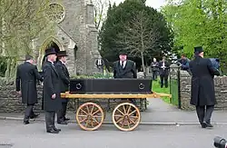 Horwood's skeleton was eventually buried alongside his father on 13 April 2011 at 1.30 pm at Christchurch, Hanham, exactly 190 years to the hour after he was hanged.[23] The funeral was arranged by Mary Halliwell, the great-great-great-granddaughter of Horwood's brother.[24] The coffin was draped in velvet and carried on a wheeled bier in the manner of elegant funerals of the period of his death.[13][25]