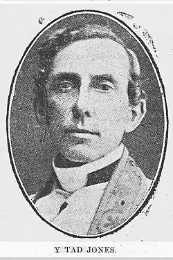 Jones was born in May, 1843, in Bala, Gwynedd, north Wales. After an education at Bala Grammar School and some private tuition from the Anglican priest and antiquarian John Williams (Ab Ithel) , he matriculated at Jesus College, Oxford in 1862. He did not complete his degree course, as he joined the Roman Catholic Church on 18 October 1865. He then studied at St. Edmund's Theological College in Ware, Hertfordshire and at St Beuno's Jesuit College in Tremeirchion, Denbighshire. He was ordained deacon and worked in Bangor, Gwynedd in 1871, preaching in both Welsh and English. He was then ordained priest in 1872 and served the town of Caernarvon until 1908, when he was moved to St Mary's College, Holywell, Flintshire as a tutor in Welsh. During his life, he translated into Welsh various religious writings, including hymns and a Prayer Book. He died in Holywell on 15 December 1910.[1]