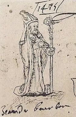 Jean de Bourbon (c. 1413 - 2 December 1485) was a French monk and prelate. An illegitimate son of John I, Duke of Bourbon, he was prior of Saint Rambert and Montverdun, abbot of Saint-André Abbey and Cluny Abbey, bishop of Le Puy-en-Velay, administrator of the Archdiocese of Lyon, and lieutenant general of the Languedoc.