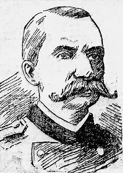 After the war, Coppinger joined the United States Army as a captain in the 23rd Infantry Regiment and was assigned to command the regiment's Company A.[14] He served in the western United States during the American Indian Wars, including command of two companies and the post at Camp Three Forks Owyhee, Idaho.[15] He led several skirmishes against hostile American Indians in 1866, 1867, and 1868, and in 1869 received brevet promotion to colonel in recognition of his heroism.[16] In the mid-1870s, Coppinger commanded the post at Fort Reno, Indian Territory.[17] In March 1879, Coppinger was promoted to major in the 10th Infantry Regiment, and in October 1883, he received promotion to lieutenant colonel of the 18th Infantry Regiment.[3] For several years, Coppinger served as acting inspector general of the Department of the Missouri, which was commanded by Major General John Pope.[18]