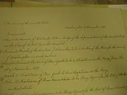 Lame duck president John Quincy Adams nominated Crittenden to the U.S. Supreme Court on December 17, 1828, but senators who supported president-elect Jackson voted to postpone confirmation until Jackson could nominate his own man. After his brief service as Kentucky secretary of state, the state legislature elected Crittenden to the second of his four non-consecutive stints in the U.S. Senate. Upon his election as president, William Henry Harrison appointed Crittenden as Attorney General, but five months after Harrison's death, political differences prompted him to resign rather than continue his service under Harrison's successor, John Tyler.