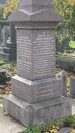 Kensit died aged 49 on 8 October 1902, of pneumonia and blood poisoning, the result of a wound he received in September that year when he was struck by a chisel thrown by a protester as he arrived at a meeting in Birkenhead.[2][7] A local labourer, John McKeever, was arrested and tried for Kensit's murder but was acquitted after a four-day trial in December 1902.[8] Kensit was buried at Hampstead Cemetery.