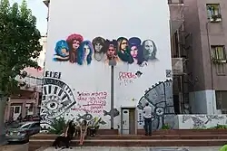 The "27 Club" mural features portraits of seven musicians who died at age 27 and was praised for both scale and narrative depth.[12] Kiss decided to include a portrait of herself as well, with the intention of erasing her own portrait when she would turn 28.[11] Over the years, the work has become known as one of Israel's must-see street artworks and has been featured in the Israeli street art documentary The Streets Are Ours ("HaRehovot Hem Shelanu").[13]