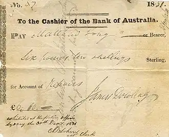 In December 1831 Knatchbull purchased clothes from Charles Bailey's shop in George Street, Sydney, payment for which he tendered a cheque signed by Justice Dowling, to be drawn upon the Bank of Australia. Bailey accepted the cheque but was later informed by the bank that it was a forgery. Bailey later recognised Knatchbull in the market and had him taken into custody.[28] He was tried on 22 February 1832 in the Supreme Court before Justice Stephen, charged with "falsely making, forging, and counterfeiting an order for the payment of money" bearing the signature of James Dowling, "with intent to defraud Charles Bailey". The jury found the prisoner guilty. Knatchbull was initially sentenced to death, which was soon afterwards commuted to incarceration for seven years.[29][12] He was taken to the prison hulk Phoenix, moored on Sydney Harbour, to await transportation to the penal settlement at Norfolk Island.[27]