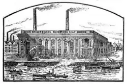The first of John Knight's factories was based next to the London Docks by the River Thames. This was a busy industrial area of town. The company hired and trained hundreds of local workers for the factory in East London. The business became known for producing high-quality Primrose Soap, Castile soap, and "John Knight's Family Health Soap" to promote public health. John Knight's soaps, oils and candles were used in hospitals and by families throughout England.[5]