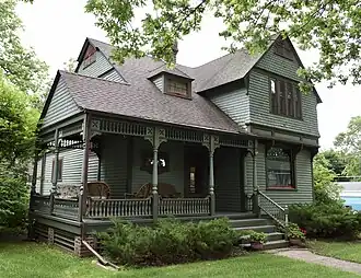 The John L. Etzel House is a historic building located in Clear Lake, Iowa, United States. Etzel was a local merchant and financier. He was an incorporator and served as president of the Cerro Gordo State Bank. He and his brother George founded Clear Lake Electric Light and Power Company and he served as its president. Etzel was appointed the local postmaster in 1885. He was the first person to own this house, which is an example of late Victorian eclectic design. It was one of seven similar houses that were built by local banker Frank Rogers between 1890 and 1910.[2] Completed in 1894, the two-story frame house features an irregular plan. The second story of the main facade is cantilevered over the first story, and supported by four ornate brackets. The gabled front porch, which extends beyond the side of the house, has turned posts and gingerbread ornamentation. It was listed on the National Register of Historic Places in 1983.[1]