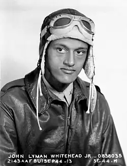 John Lyman Whitehead Jr. was born in Lawrenceville, Virginia, on 14 May 1924. His father, John Lyman Whitehead Sr, was a 1916 Yale graduate who served as the Business Manager and Treasurer at the now-defunct Saint Paul's College.[1] In 1942, he found work as a line boy at Charleston Airport. He joined the Enlisted Reserve Corps in 1942, and enlisted in the United States Army Air Corps the following year, when he reached the minimum age of 19 during World War II. He was selected for training as a pilot, and sent to Tuskegee Army Air Field in Alabama, where he became one of the Tuskegee airmen. He earned his wings on 8 September 1944, and was commissioned as a second lieutenant.[2]