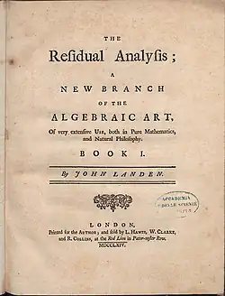 - ^ Guicciardini, Niccolò (1989). "Landen's Residual Analysis". The Development of Newtonian Calculus in Britain 1700–1800. New York: Cambridge University Press. pp. 85–89. ISBN 0-521-36466-3.
