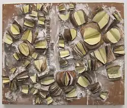 His "skoob" ("books" written backwards) works using books or materials derived from them had the power to shock. He moved from collages to towers of books which he then burnt, awakening uncomfortable echoes of the Nazi regime's public burning of banned books.[1]