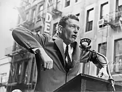In 1965, Lindsay was elected Mayor of New York City as a Republican with the support of the Liberal Party of New York in a three-way race. He defeated Democratic mayoral candidate Abraham D. Beame, then City Comptroller, as well as conservative thinker and National Review founder William F. Buckley Jr., who ran on the Conservative Party line. The unofficial motto of the campaign, taken from a Murray Kempton column, was "He is fresh and everyone else is tired".[2][15]