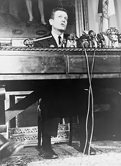 That same year, 1968, also saw a three-day Broadway strike and a nine-day sanitation strike.[20] Quality of life in the city reached a nadir during the sanitation strike as mounds of garbage caught fire and strong winds blew the filth through the streets.[21] In June 1968, the New York City Police Department deployed snipers to protect Lindsay during a public ceremony, shortly after they detained a knife-wielding man who had demanded to meet the mayor.[22] With the schools shut down, police engaged in a slowdown, firefighters threatening job actions, the city awash in garbage, and racial and religious tensions breaking to the surface, Lindsay later called the last six months of 1968 "the worst of my public life."[1]