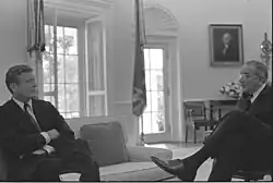 Lindsay served on the National Advisory Commission on Civil Disorders, known as the Kerner Commission, and was its vice chairman. This body was appointed in 1967 by President Johnson after riots in urban centers of the US, including Newark and Detroit. Lindsay maximized publicity and coverage of his activities on the commission, and while other commissioners made inconspicuous visits to riot-damaged sites, Lindsay would alert the press before his fact-finding missions. Nonetheless, he was especially influential in producing the Kerner Report; its dramatic language of the nation "moving toward two societies, one black, one white—separate and unequal" was consistent with his rhetoric.[23]