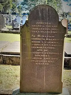 Mackenzie died of a heart attack, while either visiting or living at his elder son's property, 'Moelle' (or 'Moelly'), and he was buried there. There is a memorial erected to his memory in the cemetery at Nowra.[38] with an inscription reading: "Corunna : Salamanca : Vittoria : St. Sebastian : Nive : Peninsula : Blenkensburgh [sic]. In memoriam, John Kenneth Mackenzie, sometime Lt.-Colonel H.M.4th King's Own Royal Regiment Foot. One of Wellington's Peninsula soldiers. Departed this life 14th August,1857. Aetat 66."[51][3][1] His wife Charlotte died at 'Coodra Vale', the home of her daughter Janet and son-in-law, Stewart Ryrie, Junior, at Wee Jasper, near Yass, in 1875.[2][52]