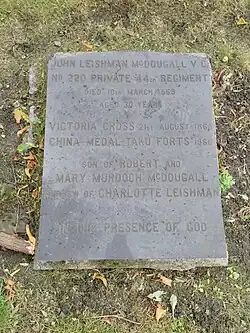On 21 August 1860 at the Taku Forts, China, Private McDougall with an officer of his regiment (Robert Montresor Rogers) and a lieutenant of the 67th Regiment (Edmund Henry Lenon) displayed great gallantry in swimming the ditches and entering the North Taku Fort by an embrasure during the assault. They were the first of the British established on the walls of the Fort.[1]