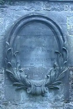 He was buried at Dean Cemetery in Edinburgh, with his wife Catherine Jemima Stewart who predeceased him in 1915.[1] The grave is in the north section against its south wall adjoining the original cemetery.