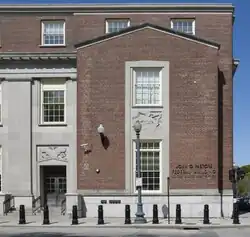 The building's exterior materials are red brick and limestone, with a granite base. A two-story, five-bay limestone frontispiece graces the east facade. A granite balustrade extends between the two entries, while a concrete and granite ramp was added to the south entrance in 1983. Streamlined pilasters are centered between the bays of windows and doors. A simple cornice with square dentils extends along the top of the frontispiece, and is echoed by a streamlined band of limestone along the roof's edge. Bronze-clad double doors are at each entrance. Projecting, gabled brick pavilions are located at either end of the facade. Each has centered windows framed with a limestone surround.