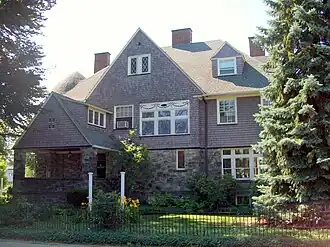 Built in 1890, this historic structure is a three-story, stone and shingled dwelling that was designed in a Richardsonian Romanesque style. It features a steep hipped roof, four tall chimney stacks, a semi-circular turret, porch supported by massive stone columns, and bay windows.[2] The Jefferson House is currently occupied by the administrative offices of the Northern Pennsylvania Regional College.