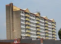 Poulson also found a useful contact in Andrew Cunningham, a senior figure in both the General and Municipal Workers Union and the Labour Party in North East England. Some of Poulson's largest residential blocks were built in Cunningham's home town of Felling, County Durham. Cunningham was later imprisoned for his dealings with the architect.[11] Poulson's work in Felling consisted of the building of one 16-storey high-rise apartment block with six seven-storey blocks of maisonettes surrounding it. These were approved in 1966. Four of the low-rise maisonette blocks were demolished in 1987 owing to their poor state of repair and tenants dislike of them. Two maisonette blocks and the high-rise block Crowhall Tower remain.[12]