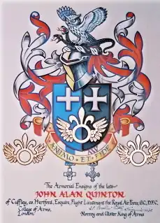 The Coat-of-Arms was granted by the College of Arms with the assistance of John Brooke-Little CVO FSA Norroy and Ulster King of Arms. The design shows an eagle owl (symbolising the Night Fighters) clutching a twin-headed serpent (symbolising the two enemies Germany and Japan) above a background of night and day. The winged amulet symbolises a navigator and the fleur-de-lis represent the Boy Scouts. The Motto – 'Animo et Fide' (Courage and Faith) – was chosen by his eldest grandson, Jason Quinton, as being appropriate for his grandfather.