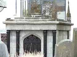 Redmond family vault (in a hollow, partially restored, top relief missing, unnamed) seen from entrance gate.