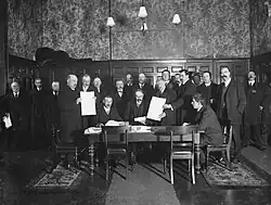 Then followed William O'Brien's amicable and conciliatory Land Conference of 1902 involving leading landlords under Lord Dunraven and tenant representatives O'Brien, Redmond, Timothy Harrington and T. W. Russell for the Ulster tenants.[8] It resulted in the enactment of the unprecedented Land Purchase (Ireland) Act 1903. Redmond first sided with O'Brien's new strategy of "conciliation plus business", but refused O'Brien's demand to rebuke Dillon for his criticism of the Act, leading to O'Brien's resignation from the party in November 1903.[9] Redmond approved of the unsuccessful 1904 devolution proposals of the Irish Reform Association.[2] Despite their differences, Redmond and Dillon made a good team: Redmond, who was a fine speaker and liked the House of Commons, dealt with the British politicians, while Dillon, who disliked London, the Commons and their influence on Irish politicians, stayed in Ireland and kept Redmond in touch with national feelings.[2][10]