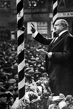 During 1915 Redmond felt secure in his course and that the path was already partly cleared for Home Rule to be achieved without bloodshed. He was supported by continued by-election successes of the IPP, and felt strong enough to turn down the offer of a cabinet seat, which would have offset Carson's appointment to the cabinet but would have been unpopular in Ireland. Even in 1916, he felt supremely confident and optimistic despite timely warnings from Bonar Law of an impending insurrection.[2] Redmond did not expect the 1916 Easter Rising, which was staged by the remaining Irish Volunteers and the Irish Citizen Army, led by a number of influential republicans, under Patrick Pearse. Pearse, who had in 1913 stood with Redmond on the same platform where the Rising now took place, had at that time praised Redmond's efforts in achieving the promise of Home Rule. Redmond later acknowledged that the Rising was a shattering blow to his lifelong policy of constitutional action.[4] It equally helped fuel republican sentiment, particularly when General Maxwell executed the leaders of the Rising, treating them as traitors in wartime.