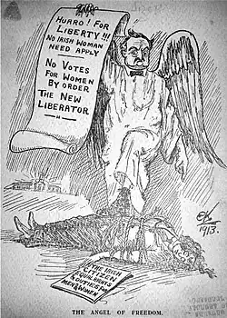 Redmond was an opponent of votes for women and had abstained on votes regarding the topic. On 1 April 1912 he informed a delegation of the Irish Women's Franchise League that he would not support giving women the vote if home rule was granted.[14][15] Redmond's opposition to female suffrage drew the ire of the suffragettes leading to the defacing of a statue of Redmond in 1913 by a suffragette protestor.[16]