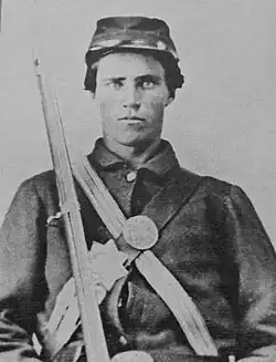 One of the 19 of 22 men (including 2 civilians) who, by direction of Gen. Mitchell (or Buell), penetrated nearly 200 miles south into enemy territory and captured a railroad train at Big Shanty, Ga., in an attempt to destroy the bridges and track between Chattanooga and Atlanta.[2]