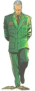 John Ryker is a corrupt U.S. Army general who joined the military at a young age and wanted to help determine future history from the shadows. One of his most prominent actions was manipulating the creation of the conspiracy around John F. Kennedy's assassination where apparently two Corsican mercenaries were the killers, but at the time was deemed too expensive to wage World War Three, so the idea of a conspiracy was created. When his wife Lucy Ryker developed cancer, Ryker used the military to hunt down Bruce Banner, who turned into the Hulk after gamma radiation exposure during a nuclear test that Ryker supervised.[2] Ryker initially irradiated various subjects to try and duplicate the same accident behind the Hulk, with the goal of allowing him to isolate the Hulk's ability to cope with the radiation and use it to heal his wife. His closest success was Benjamin Tibbits, who was transformed into Flux and used as a near-mindless soldier against the Hulk.[3] However, his brutal treatment of the Hulk not only broke down the Hulk's other personalities' mental barriers from taking control, including the Devil Hulk, but also convinced General Thunderbolt Ross to turn against Ryker and free their long-time enemy. Taking Lucy hostage, Ross told the truth to Lucy, prompting Ryker to depart as Lucy coldly told him that Lucy did not ask to be healed at the cost of innocent people.[4]