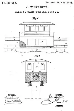 At the 1876 Centennial Exposition, Westcott exhibited a model of his patented design for a monorail – which he called a "saddlebag railroad".[27] In 1879, Westcott was again elected to the Florida House of Representatives, representing St. Johns County as a Democrat. During his one term in office, Westcott was the chairman of the Committee on Railroads and Canals. In this role, Westcott worked on legislation with Sam Hope regarding the expansion of Florida's railroad and canal systems.[6][30] He was also one of Florida's delegates to the 1876 Democratic National Convention, where he was a member of the Committee on Resolutions and supported the candidacy of Samuel J. Tilden. At age 78, he was the oldest member of the 1885 Florida constitutional convention.[30][31]