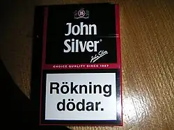 An old Swedish pack of John Silver cigarettes, with a Swedish text warning at the bottom of the pack. | |