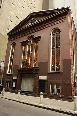 Founded in 1766 as the Wesleyan Society in America, the John Street Methodist Church is the oldest Methodist congregation in the United States.[13][14] Construction of the present church, built in 1841 was necessitated by the widening of John Street. The Wesley Chapel Museum houses, among other artifacts the Wesley Clock, a gift of John Wesley in 1769. Peter Williams, who served as a sexton, was a slave. The church purchased his freedom, and Williams became a tobacco merchant.[1]